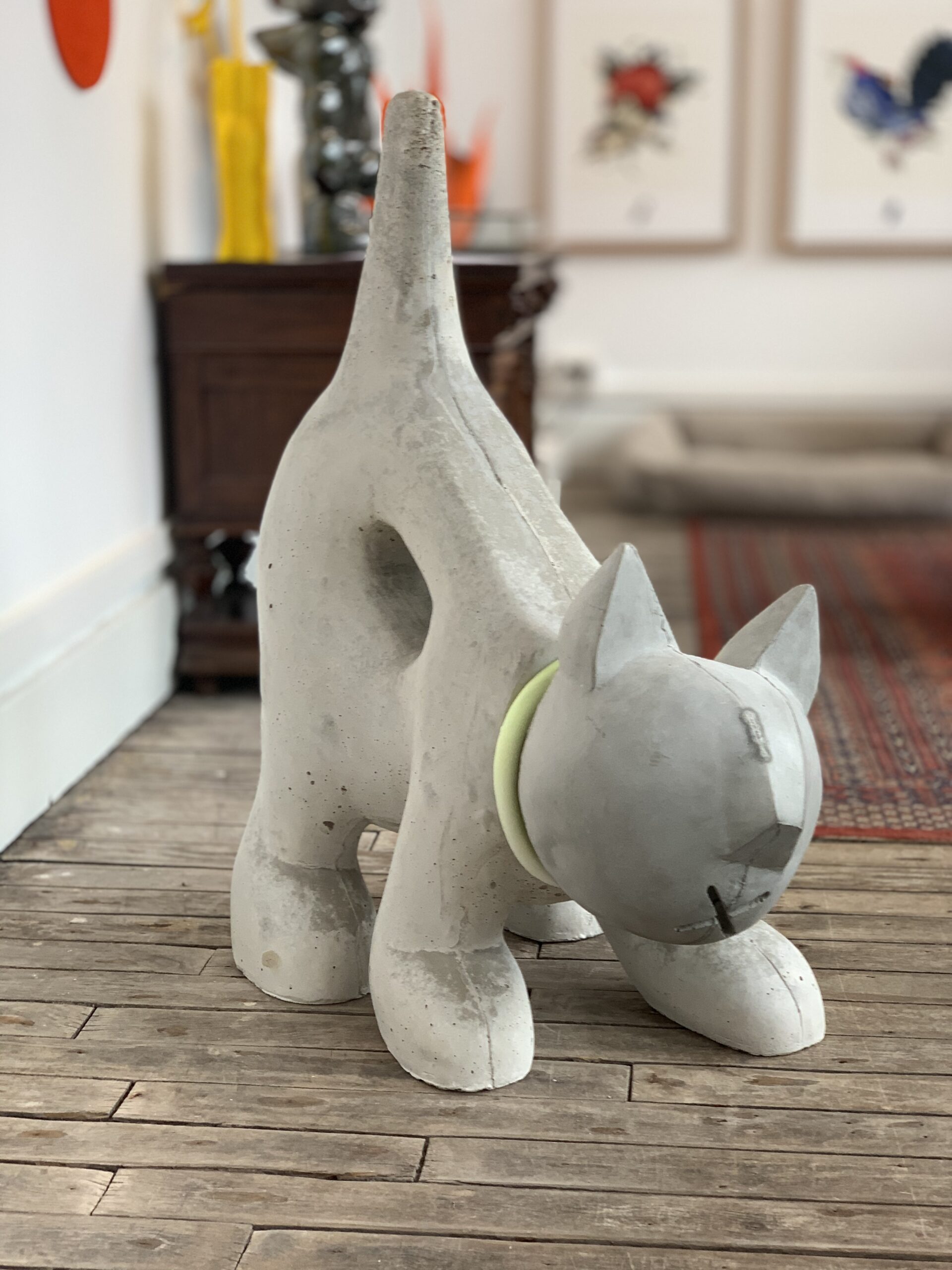 Eindelijk een levensgrote vriend voor de bekende betonnen hond in Untitled. Dit weekend kwam de Poes van Sander Buijk bij ons aangetrippeld en ze vlijde zich tevreden neer in onze galerie. Deze kat van gegoten beton en met een glow-in-the-dark halsband is het nieuwste kunstwerk van Sander Buijk.